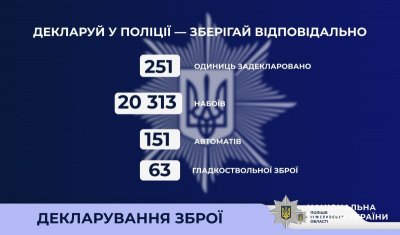 Від початку декларування вогнепальної зброї до секторів контролю за обігом зброї поліції Миколаївщини звернулись 229 громадян, які задекларували 251 одиницю зброї та понад 20 тисяч набоїв до неї, з них: 151 автомат, 18 карабінів, 19 пістолетів та 63 одиниці гладкоствольної зброї .