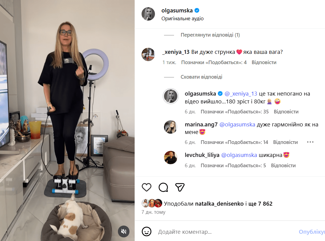 Сумська похвалилася, що тренажер їй подарувала донька. Вона тепер займається по 15 хвилин уранці та ввечері й сподівається, що результати невдовзі обов’язково будуть. Окрім смайлика з вогником від колеги по сцені Тараса Цимбалюка та компліменту на адресу стопера від Любави Грешнової, в пані Ольги поцікавилися, яку вагу має, що так ідеально виглядає. Акторка не стала приховувати, чесно відповівши:
