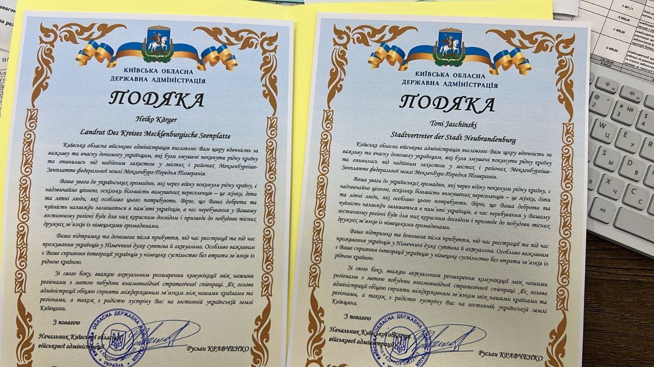 Київська обласна військова адміністрація висловлює Вам щиру вдячність за важливу та вчасну допомогу українцям, які були змушені покинути рідну країну та опинились під надійним захистом в містах та районах Мекленбургіше-Зенплатте федеральної землі Мекленбург-Передня Померанія.
