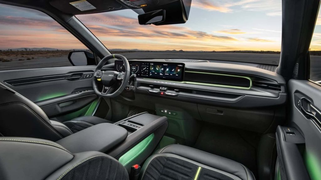 EV9 GT виділяється спортивним дизайном з унікальними 21-дюймовими колесами та салатово-зеленими акцентами в салоні. Він також оснащений спортивними сидіннями з алькантарою та масою систем допомоги водієві.