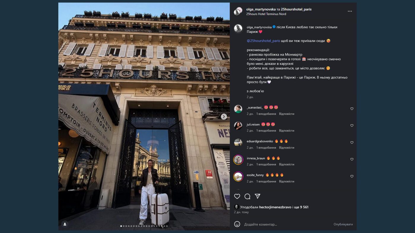 Ольга Мартиновська показала, де вона зупинилася в Парижі