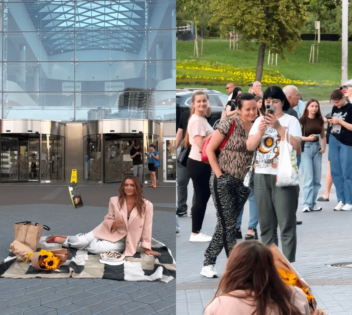 Не дуже давно пані Наталія здивувала публіку, коли розстелила ковдру просто посеред вулиці, виклала туди квіти та солодкі наїдки й влаштувала для себе хвилиночку релаксу. Звісно, відбути подібне дійство на самоті не вдалося.