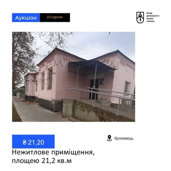 Як повідомили в Управлінні забезпечення реалізації повноважень у Сумській області РВ ФДМУ по Полтавській та Сумській областях, цього разу лот аукціону – нежитлове приміщення в м. Кролевець площею 21,2 кв.м, що обліковується на балансі Головного управління ДПС у Сумській області