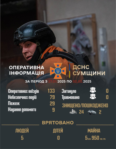 На Сумщині за тиждень зареєстровано 79 небезпечних подій 10:17 / 10 лютого 2025 Новини Суспільство