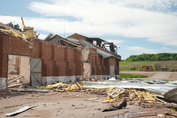 Головний інженер комбікормового заводу Микола Шевченко показав наслідки влучань російських ударних безпілотників по підприємству вночі 1 травня. Таких, каже, нарахував шість. Пошкоджені виробничий цех, зернові склади, гаражі для сільськогосподарської техніки та автомобілі підприємства. У момент влучань на території заводу перебували охоронці. Вони не травмувались.