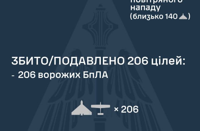 У ніч на 1 листопада сили ППО збили та подавили 206 із 223 російських ударних дронів, однак зафіксовано 17 влучань.