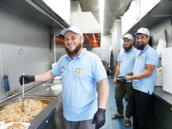 Команда проекту “Годуємо Країну, Смак Українського Криму” розгорнули біля МЦКіД «Кнєжа» мобільну кухню – велику 20-тонну фуру, яка всередині обладнана кухнею і всім необхідним – і приготували для охтирчан понад 1200 порцій плову за кримськотатарським рецептом, а до нього – овочевий салат.