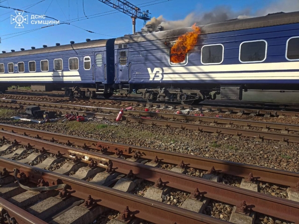 У місті Буринь загорівся один із вагонів пасажирського поїзда. Ймовірно, займання сталося під час руху. Пасажири намагалися загасити полум’я вогнегасниками, але коли вогонь набрав сили — звернулися до рятувальників.