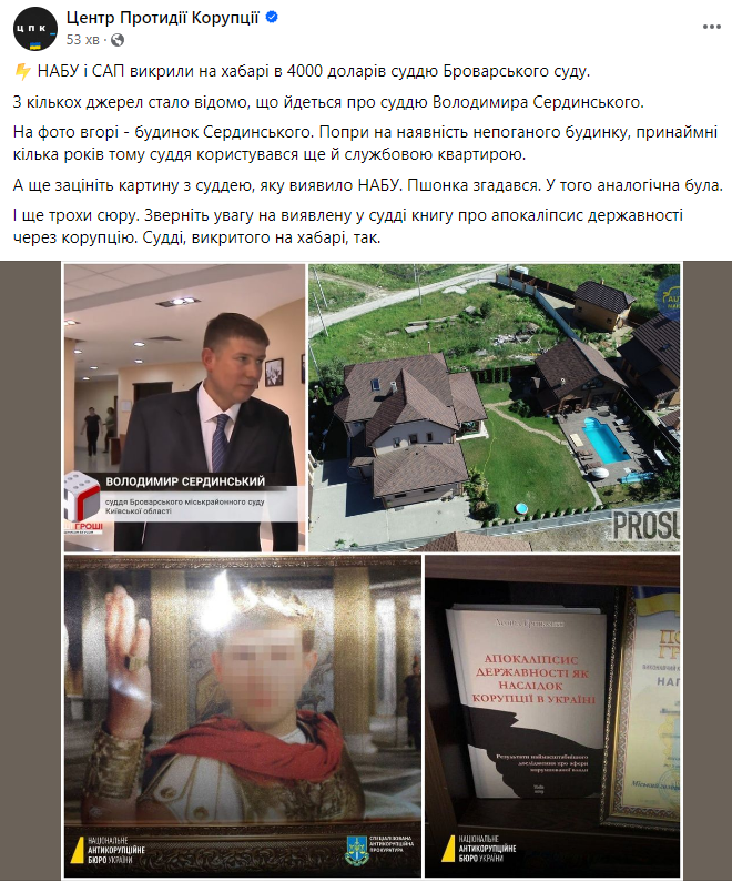 Як повідомляє Центр протидії корупції, йдеться про суддю Володимира Сердинського.