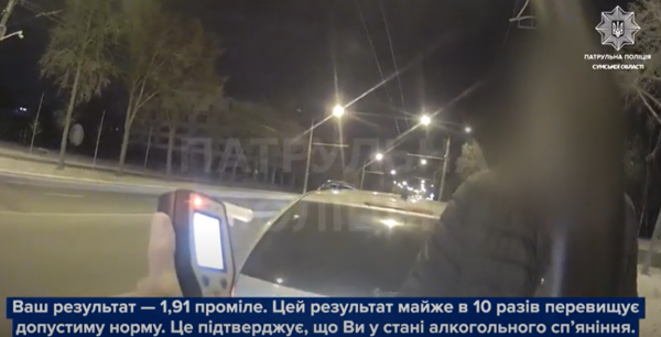 Під час спілкування з 53-річним керманичем патрульні виявили в нього ознаки сп’яніння. Чоловік пройшов огляд за допомогою спеціального приладу Драгер на місці зупинки. Результат огляду – 1, 91 проміле, що майже в 10 разів перевищує допустиму норму.