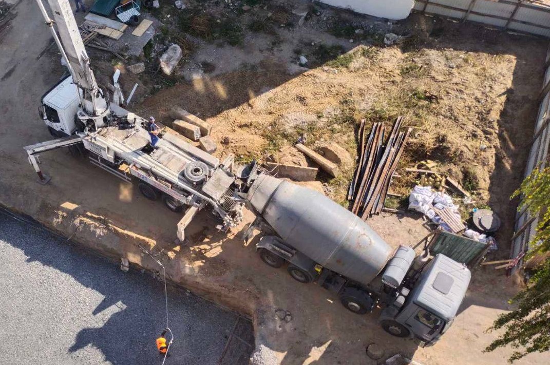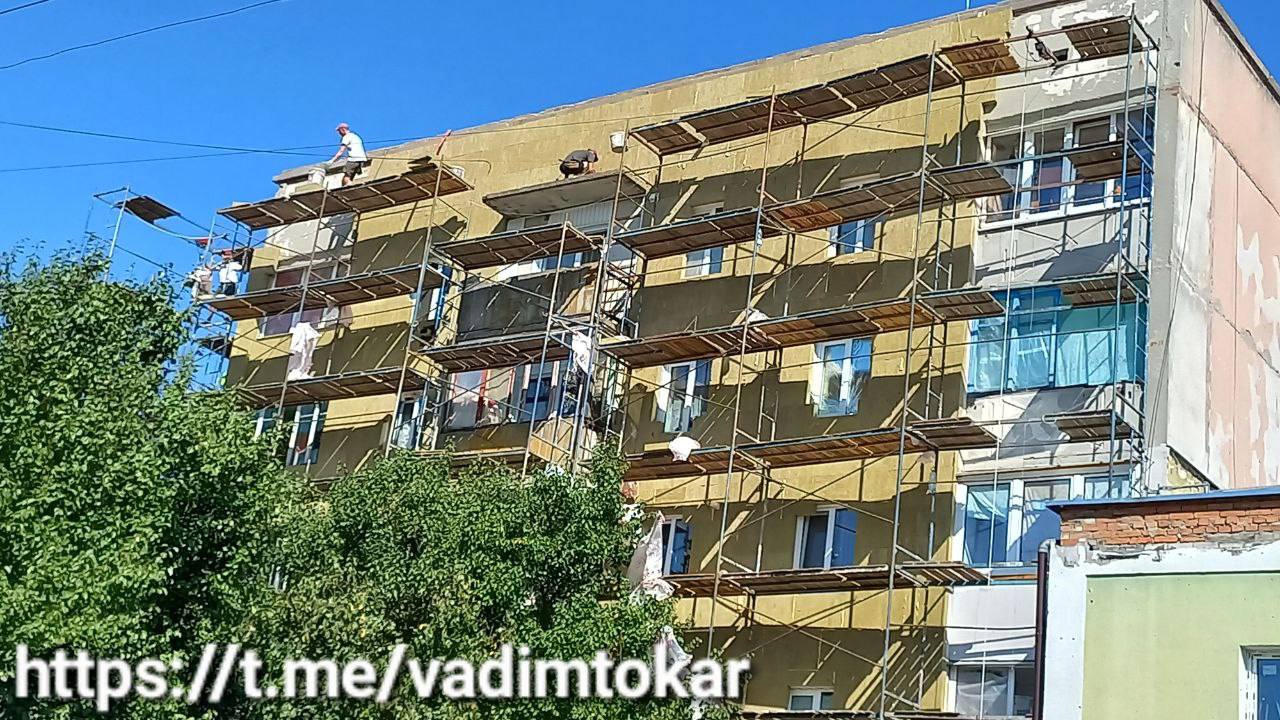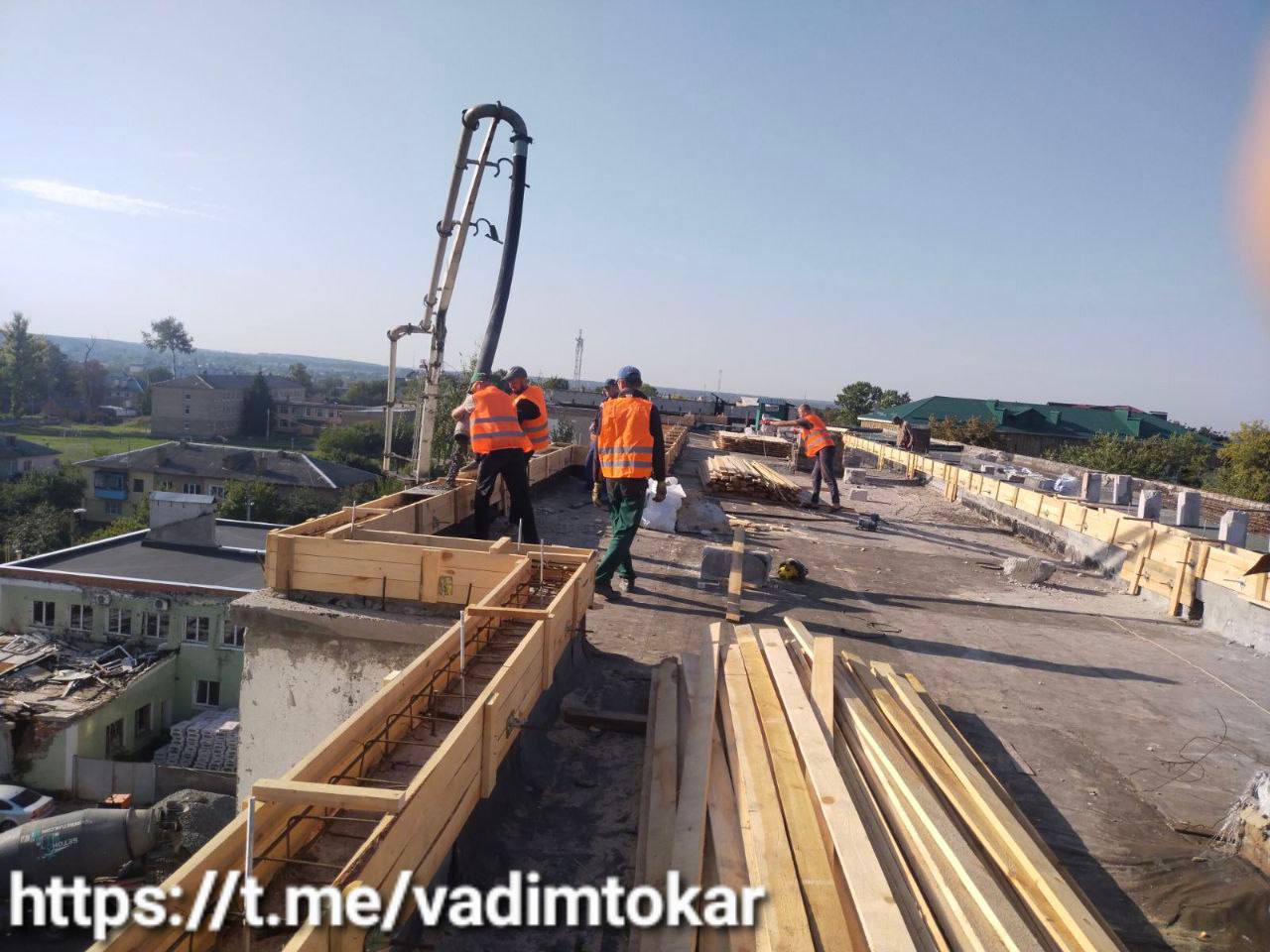 У будинку по вулиці Садова, 1 тривають роботи з утеплення фасаду, в одній частині даху залили монолітний пояс, в іншій – виконуються роботи з підготовки арматурних каркасів та установки опалубки. Одночасно будівельники вручну проводять земляні роботи для утеплення цокольної частини будинку.