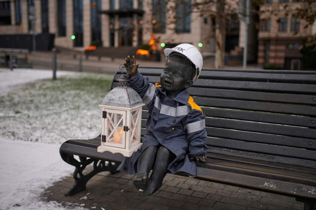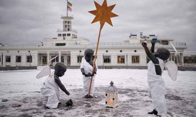 У Києві на Поштовій площі скульптури малюків-засновників міста – Кия, Щека, Хорива та їхньої сестри Либідь – одягли у костюми янголів і у форму українського енергетика до Різдва.