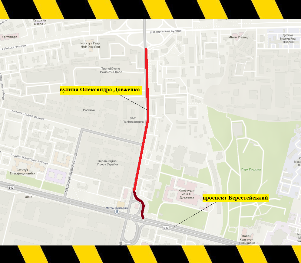 Із 6:00 до 22:00 16 вересня додатково до обмеження руху на вул. Олександра Довженка буде закритий проїзд транспорту на з’їзді із просп. Берестейського. Обмеження пов’язано з проведенням ремонтних робіт.