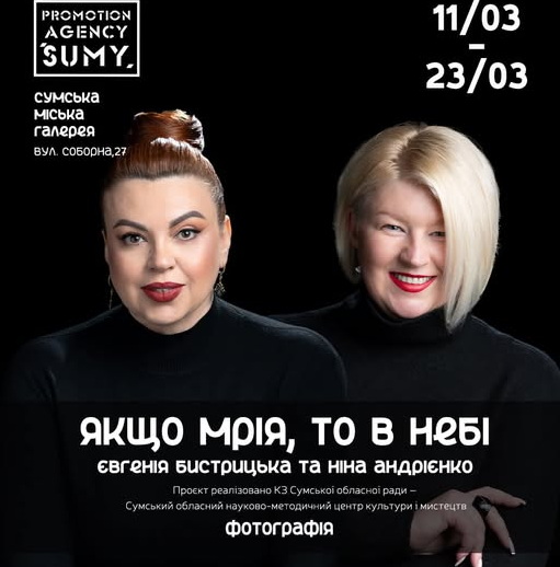 1 березня у Сумській міській галереї відкривається виставка «Якщо мрія, то в небі» – авторський проєкт Євгенії Бистрицької та Ніни Андрієнко. Початок о 16.00.