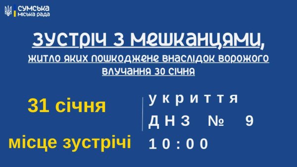 Завтра у Сумах проведуть зустріч із мешканцями-власниками пошкоджених квартир 12:29 / 30 січня 2025 Новини Суспільство