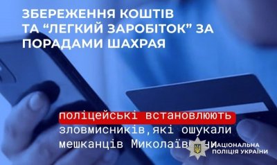 Мешканець Миколаєва, намагаючись «убезпечити» свій банківський рахунок від нібито втручання шахраїв та виконуючи вказівки псевдобанкіра, втратив 214 тисяч гривень. Водночас жителька Південноукраїнська, відгукнувшись на пропозицію «легкого заробітку», перерахувала власні заощадження у сумі понад 154 тисячі гривень нібито для збільшення прибутку. Поліцейські за вказаними фактами розпочали розслідування та встановлюють причетних до злочинів осіб.